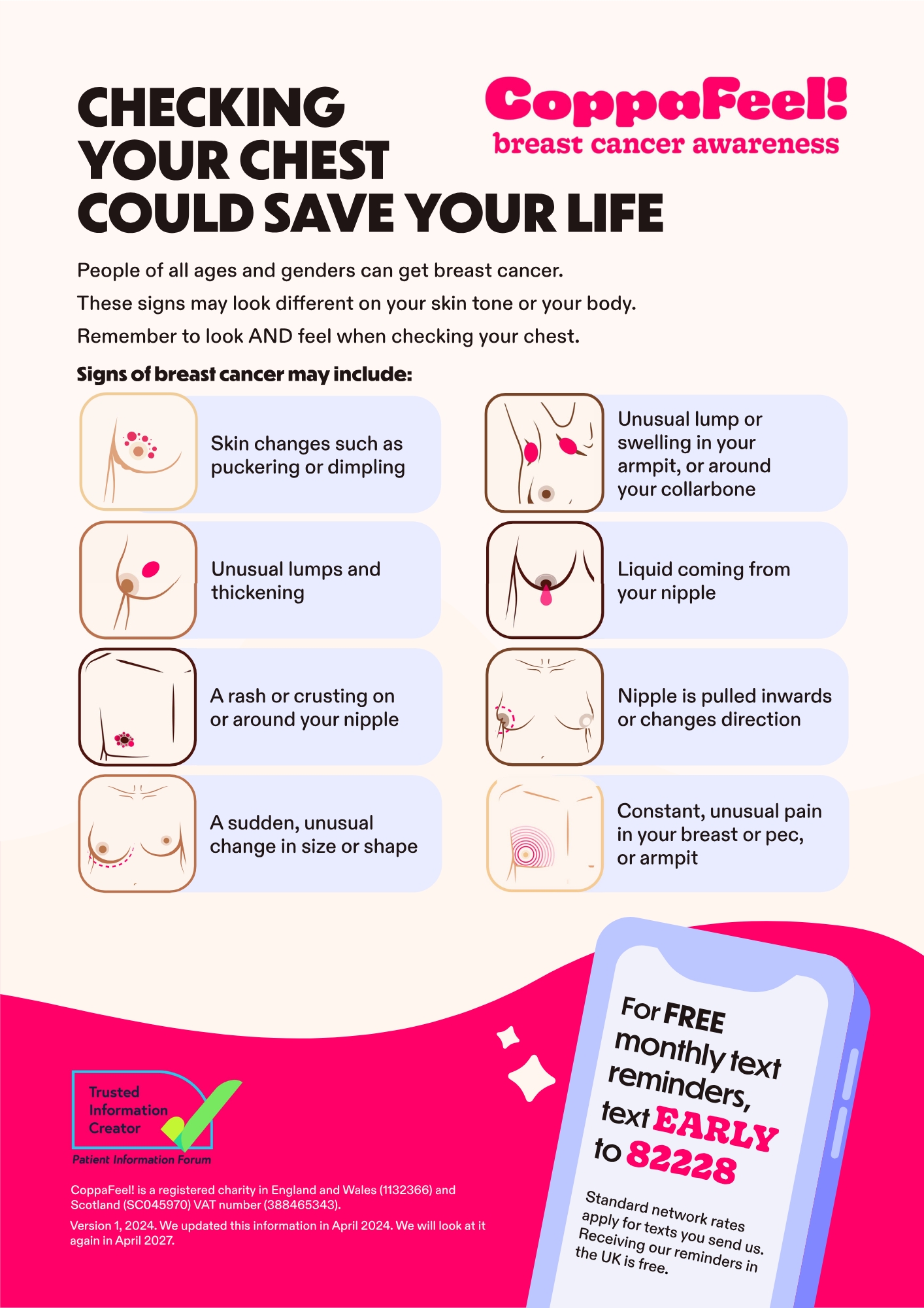 - Look AND feel – Remember to check all parts of your chest, including your armpits, up to your collarbones and your nipples.